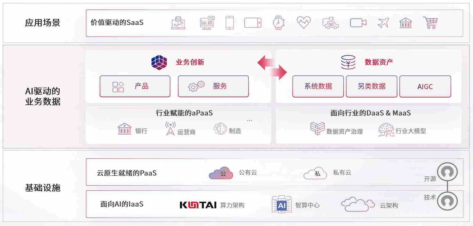 数字时代,,,围绕企业数字化转型的关键要素,,,,AG尊龙凯时数码开创性的提出数云融合战略和技术体系框架,,,,着力在云原生、、、、数字原生、、、、AI原生和信创产业上架构产品和服务能力,,为处在不同数字化转型阶段的快消零售、、、汽车、、金融、、医疗、、政企、、教育、、运营商等行业客户提供泛在的敏捷IT能力和融合的数据驱动能力,,构建跨界融合创新的数字业务场景和新业务模式,,,,助力企业级客户建立面向未来的核心能力和竞争优势,,,,全面推动社会的数字化、、、智能化转型升级。。。