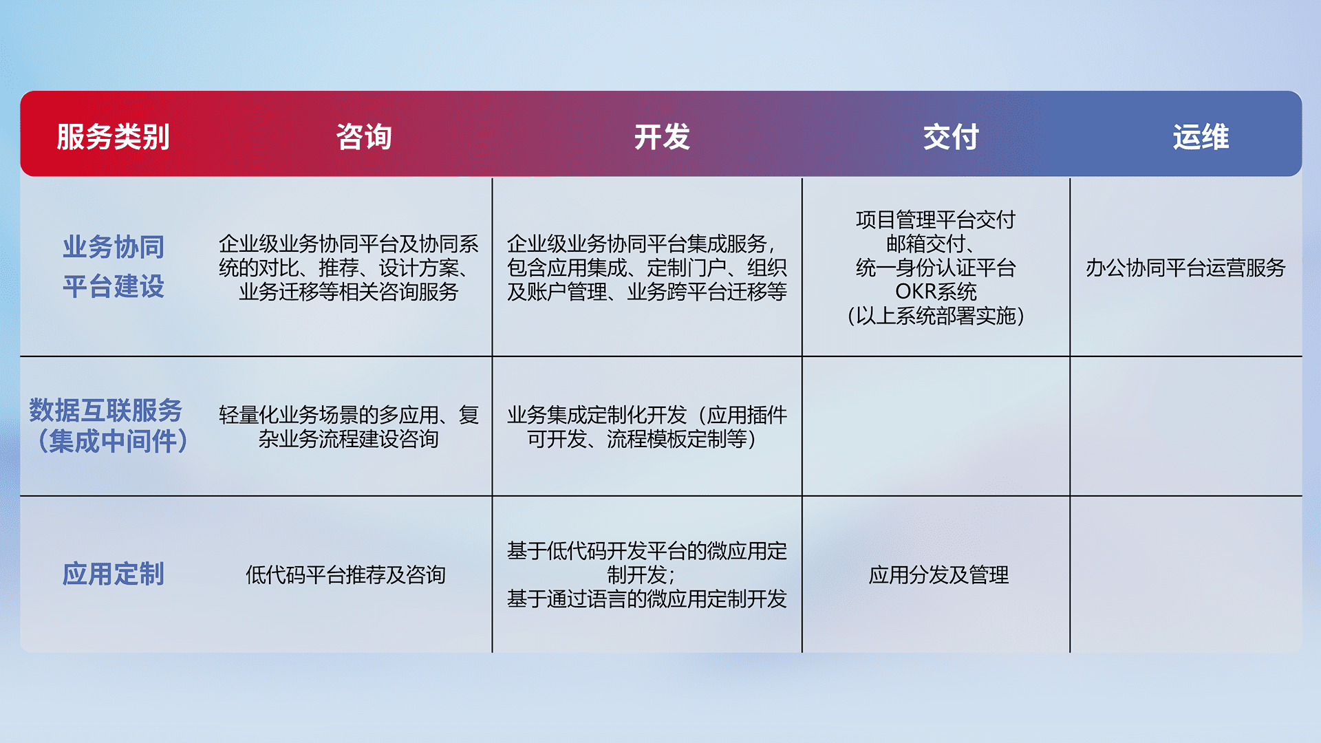 针对钉钉、、企微、、IDaas等平台级产品提供产品的规划、、方案、、、、交付、、、、定制化开发等服务,,,,实现如统一协同办公、、、、智能客户服务、、、混合会议管理、、智能数据查询、、、等业务场景,,,实现数字化转型。。。。